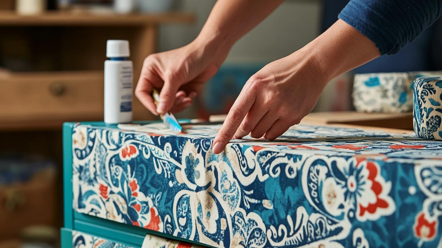Use thin cotton fabric and glue to wrap drawer fronts. Choose patterns that match your room. Cut to fit, smooth out bubbles, and seal with clear glue.