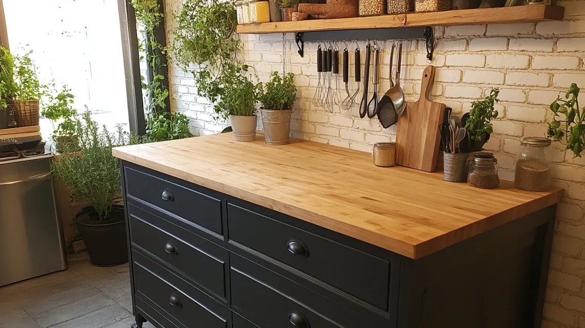 Use a wide dresser as a base for a kitchen island. Paint it, add wheels or legs, and place a butcher block or stone top. Remove some drawers for open shelves if needed.