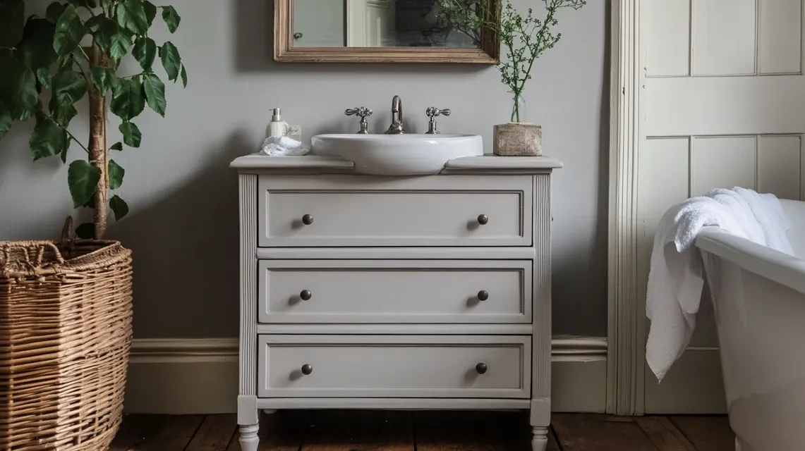 Take out the top drawers and cut space for a sink. Paint or stain the dresser and seal the surface. Now it’s a bathroom vanity with drawers for storage.