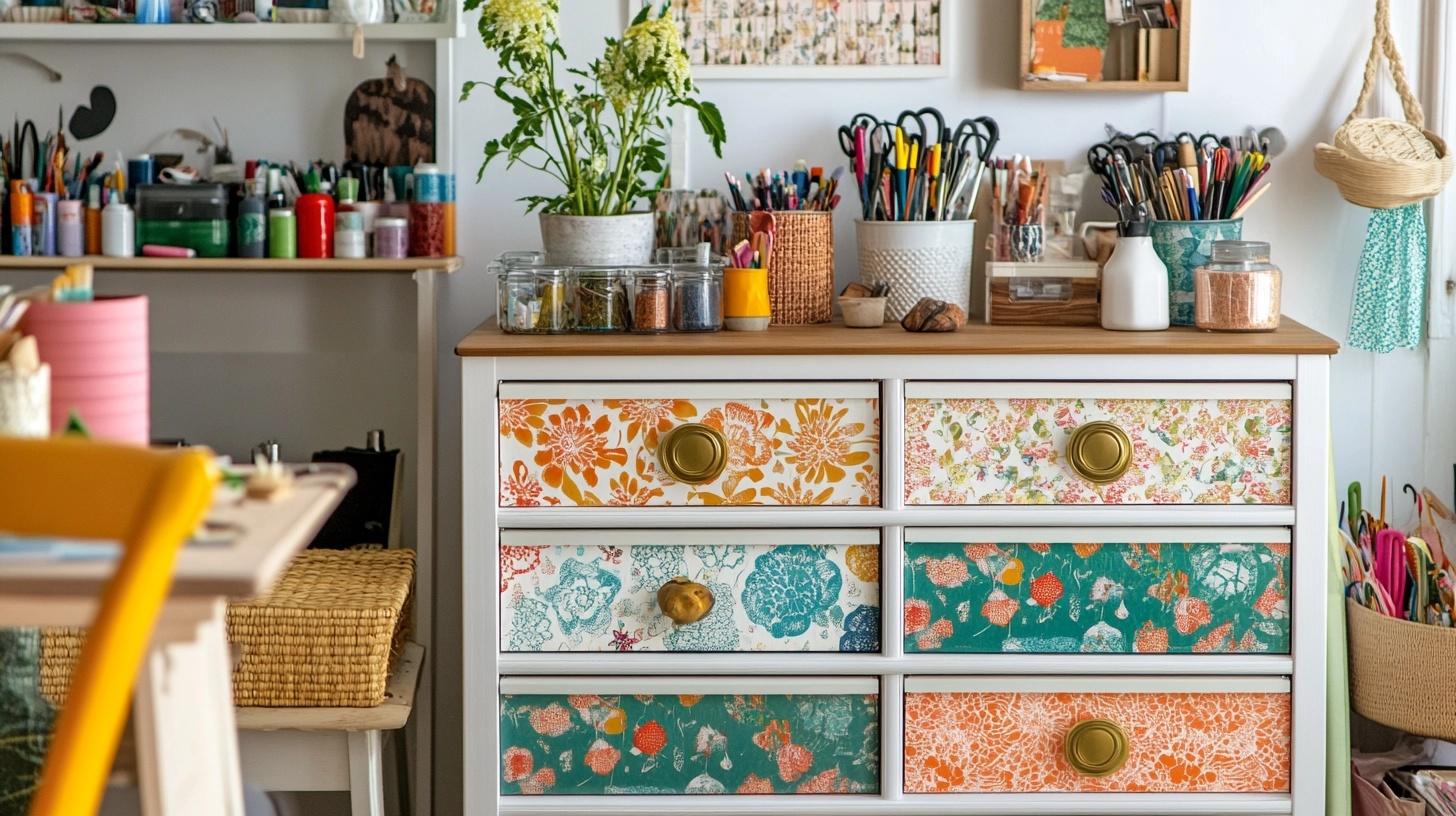 Line each drawer with colorful paper or sticky liner. Choose a bold print or a calm pastel. Cut it to size and press it in. This makes the inside of the dresser as fun as the outside. It’s a nice surprise every time you open a drawer, and it adds personality fast.