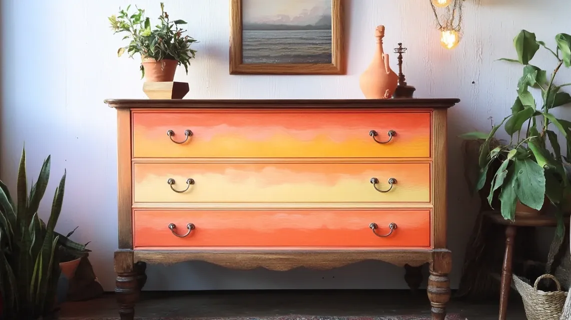 Use warm colors like orange, red, pink, and yellow to paint your dresser in layers. Try blending them together with a sponge or brush for a soft mix.